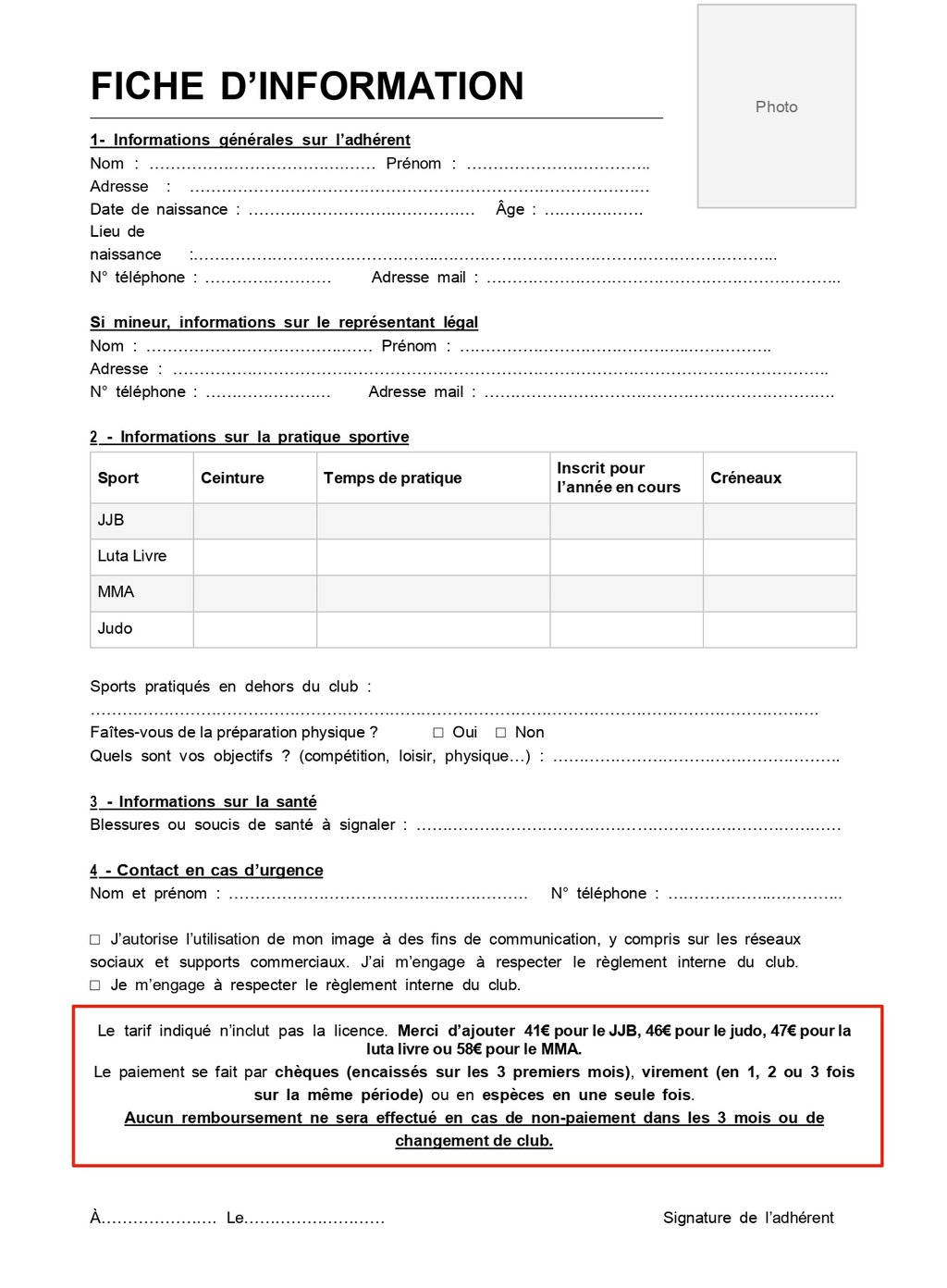 Merci de bien vouloir ajouter à la formule choisie 41€ pour le JJB, 46€ pour le judo, 47€ pour la luta livre ou bien 58€ pour le MMA.